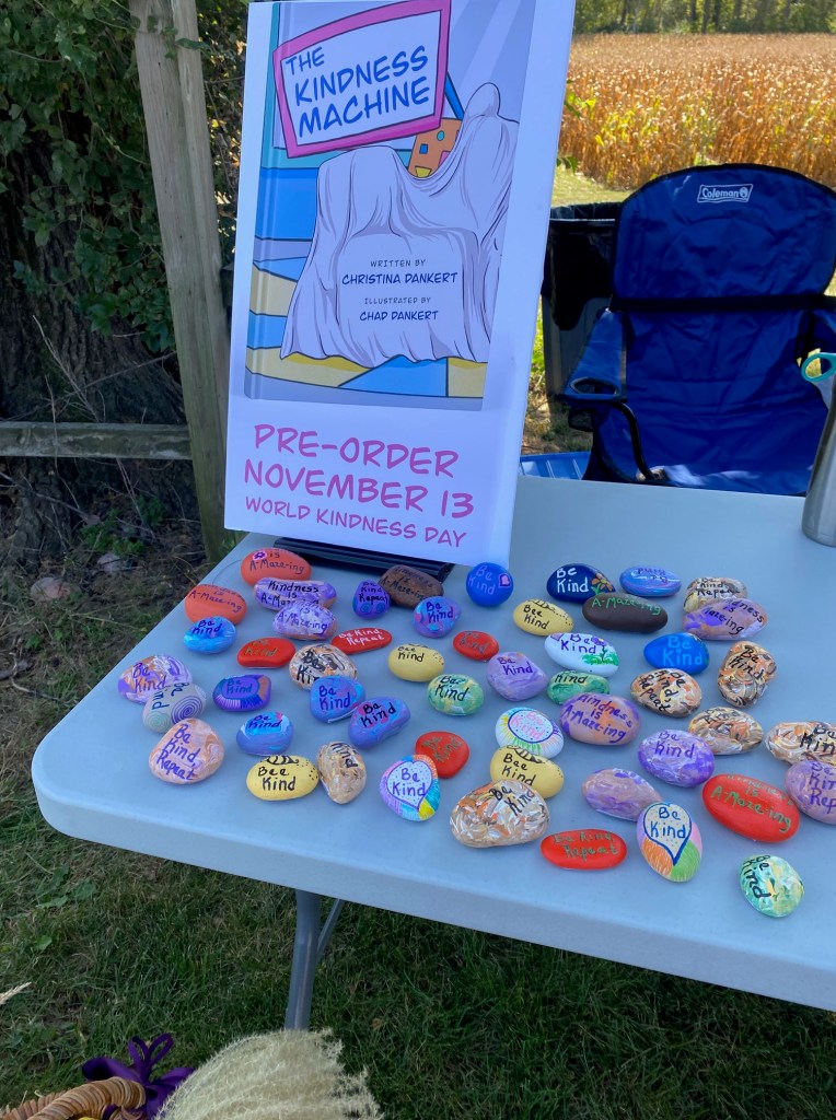 I was nervous before the event and was a little worried about doing a book event…without the actual book. I am so thrilled with how it turned out and look forward to another upcoming event in my community. We had tables for children to draw what they thought was under the sheet of The Kindness Machine cover, coloring pages, bookmarks and kindness rocks to take home. A huge shoutout to my mom who has been painting rocks for months! She came up with creative and colorful designs and we added QR codes that link to my website that we modge podged on the bottom. We encouraged the kids who visited our table, to take a rock and hide it somewhere around town. They were very excited about this take away! Thanks mom!
