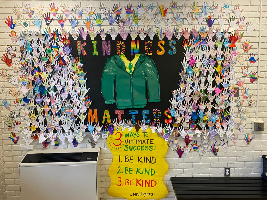 Shout out to our art teacher for drawing Mr. Rogers’ sweater, writing his quote and ordering green Mr. Rogers sweaters for our staff this year.