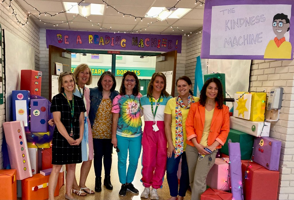I am very grateful to my coworkers who helped make this event possible. Watching the machine and our theme days come to life was so much fun. Shout out to Lisa, Jamie, Allison, Kim G., Andrea, Kim M., Susan, Jonathan, Julie, Shelly, and Hanin. Thank you to my principal for purchasing books for each classroom. Thank you to our entire staff for decorating your classroom doors with positivity and allowing me to cut into your schedule for the author visit. Check out this instagram reel documenting the week.