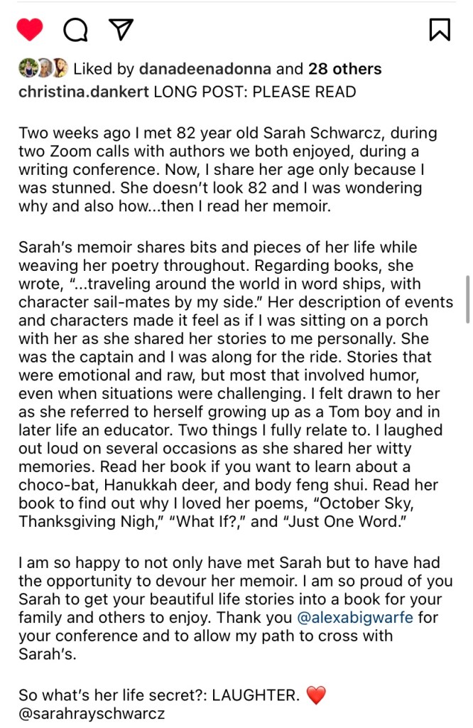 Back in April of this year, I had a strange feeling. Sarah kept popping into my head. I realized it had been a few weeks since I had received a positive comment or had seen something from her on Instagram. Upon doing a little Facebook investigating, I saw a post from her daughter that she had had a small stroke. Her daughter was lovely and shared more information and an address so our writing group could send her cards, well wishes and prayers.