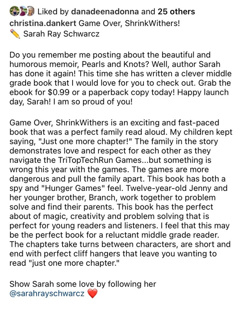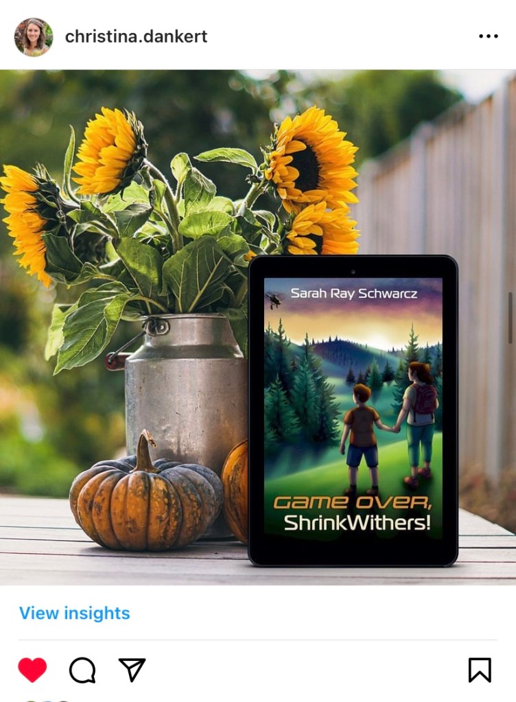 We continued to exchange encouraging messages to one another via Instagram and Facebook. She was working on a middle grade novel, Game Over, ShrinkWithers! and asked my son to be a beta reader for her. He gave feedback and then we had the opportunity to read an advanced copy. Sarah shared the cover with me, which was created by one of her granddaughters, before it had the title or her name. I took a video when I showed my son and simply asked, “Tell me what you think of this picture or what it is from…” It took a few seconds until his face lit up and he said, “It’s from the Shrinkwithers book…it looks amazing!” I sent the video to her and she said how much joy it brought to her project. During her virtual launch, my kids were on the call and able to talk to her and give her compliments for a story they truly enjoyed.