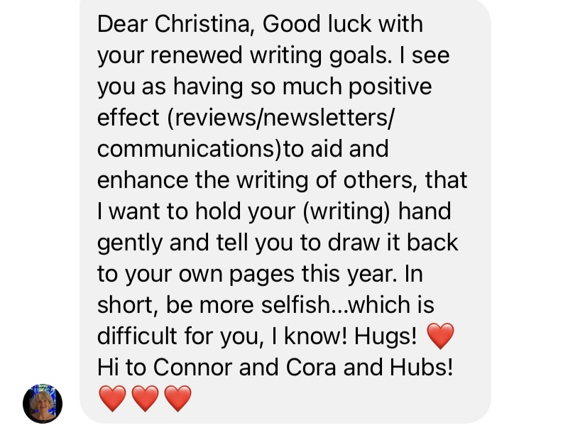 In January of 2024, I wrote how I had big writing goals. She saw the post and sent me the following message: